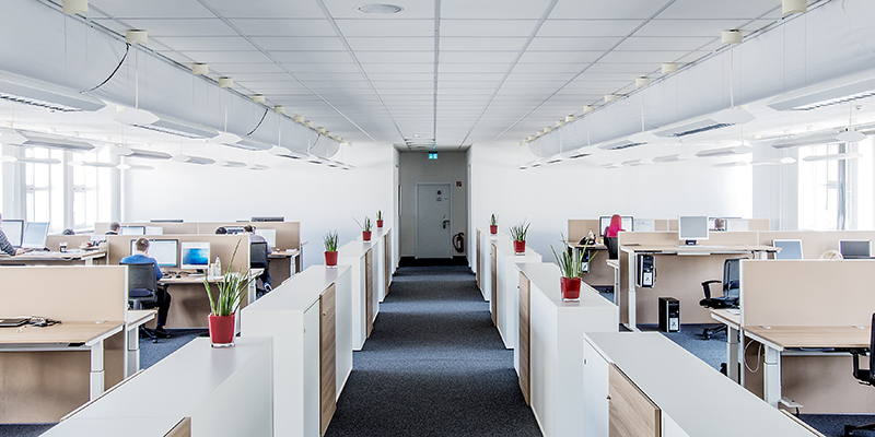 Mittels zweier jeweils über 18 Meter langer textiler Luftverteiler klimatisiert Granz das Großraumbüro von SoftMate. Außerdem: Klimaanlagen für Einzelbüros und Besprechungsräume.